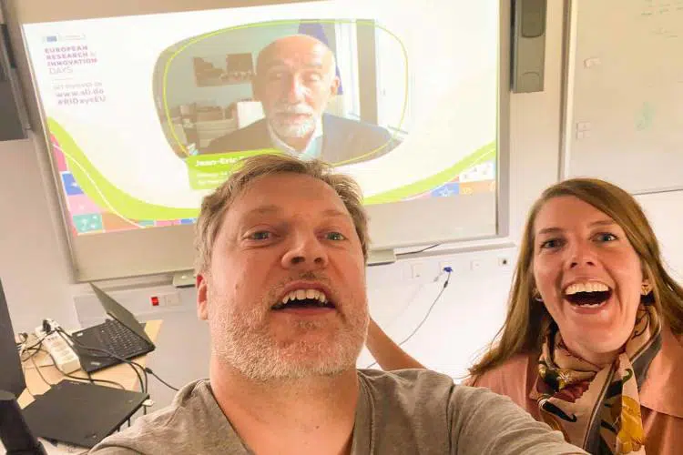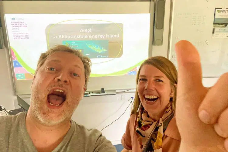 Cecilie Larsen og Halfdan Abrahamsen fra Ærø EnergyLab skrev ansøgningen til EU, og det kan her afsløres, hvordan man ser ud, når man har fået at vide, at man har vundet: